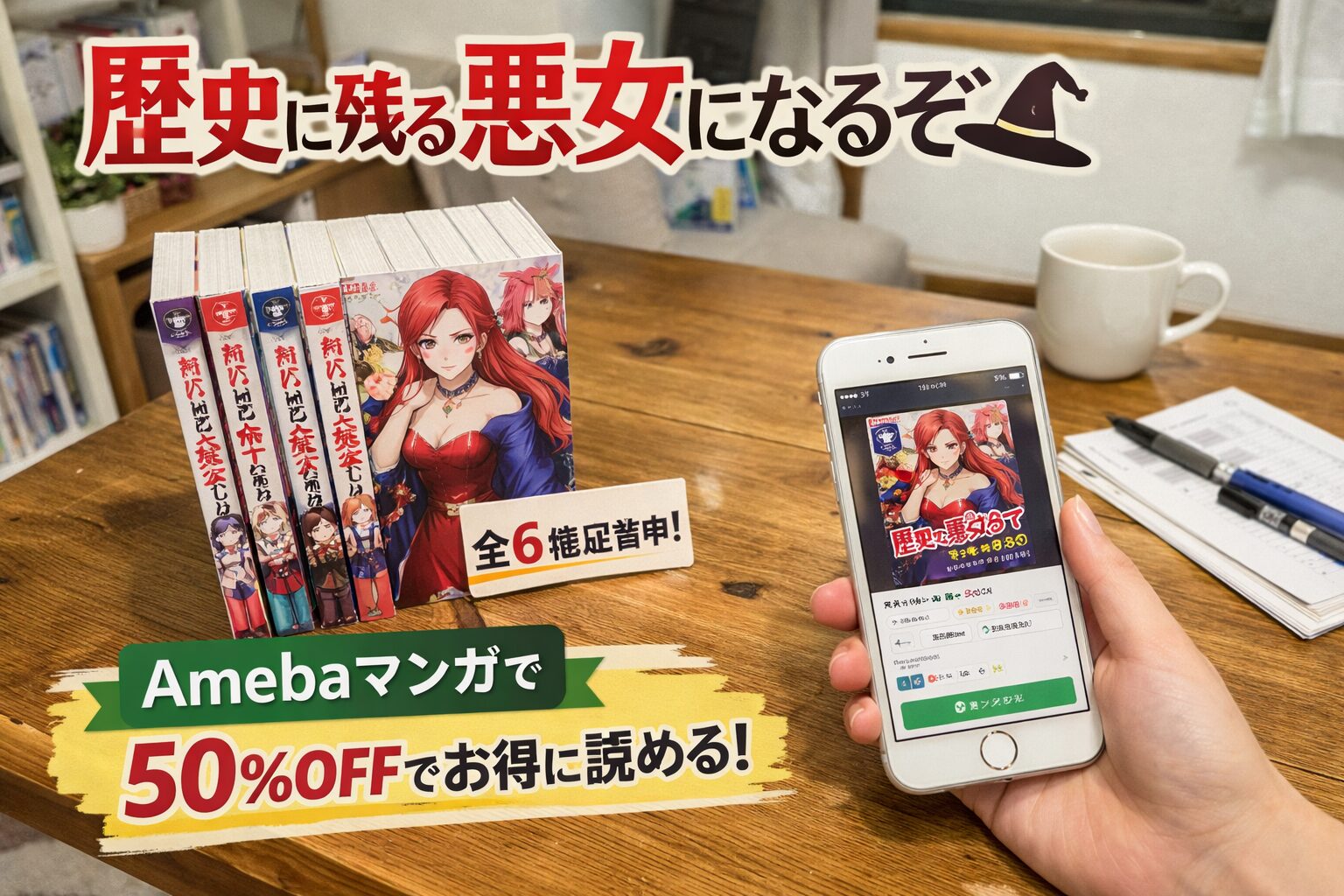 「歴史に残る悪女になるぞ」の漫画版をお得に読みたい方へ。結論から言うと、Amebaマンガなら漫画版全6巻が配信中で、初回限定の100冊50%即時還元を使えば定価4,554円のところ実質約2,277円で一気読みできます。この記事では配信状況・口コミ・お得な購入方法をまとめました。