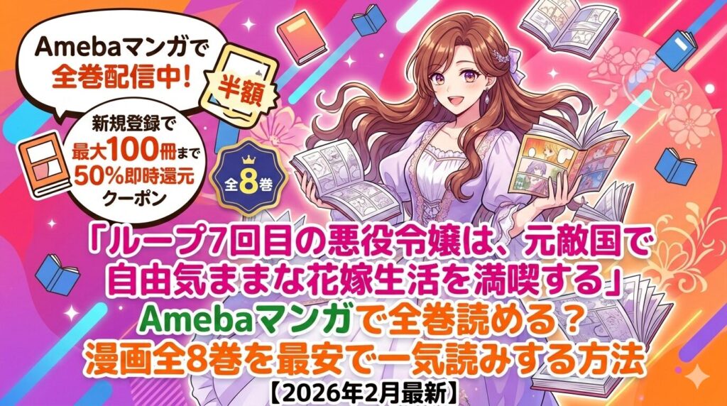 「ループ7回目の悪役令嬢は、元敵国で自由気ままな花嫁生活を満喫する」はAmebaマンガで全巻読める?漫画全8巻を最安で一気読みする方法【2026年2月最新】