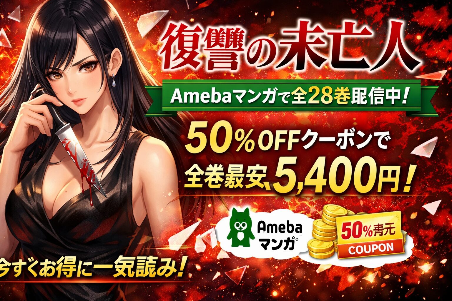 Amebaマンガの初回50%還元クーポンは100冊まで適用可能なので、全28巻をまとめて購入しても余裕を持って使い切れます。復讐劇は一気読みしてこそ爽快感が最大化する作品。途中で止められなくなること確実です。