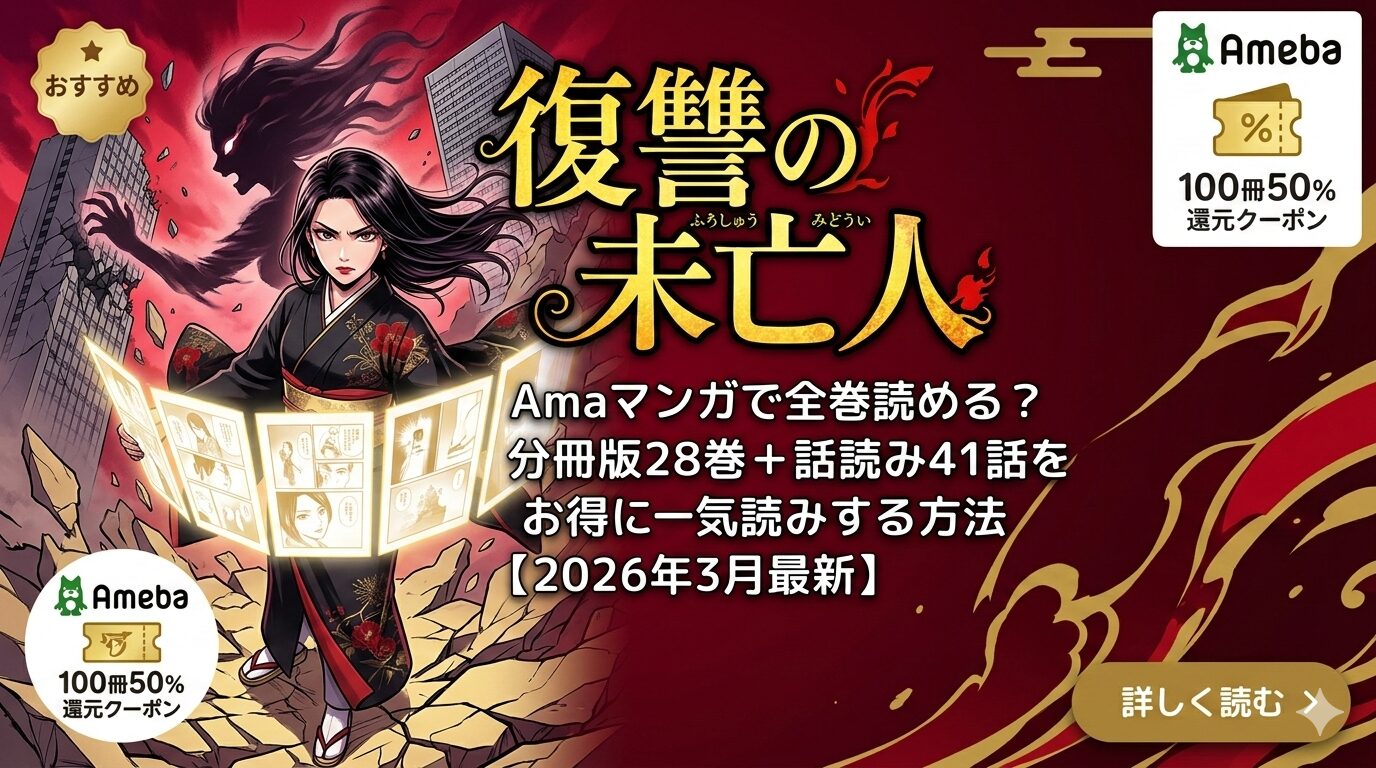 Amebaマンガなら33話分が無料で読め、さらに新規登録の100冊50%還元クーポンで全巻をお得にまとめ買いできます。復讐系漫画を一気読みするなら、これ以上にコスパの良い方法はありません。気になった方は、まず無料話から試してみてください。