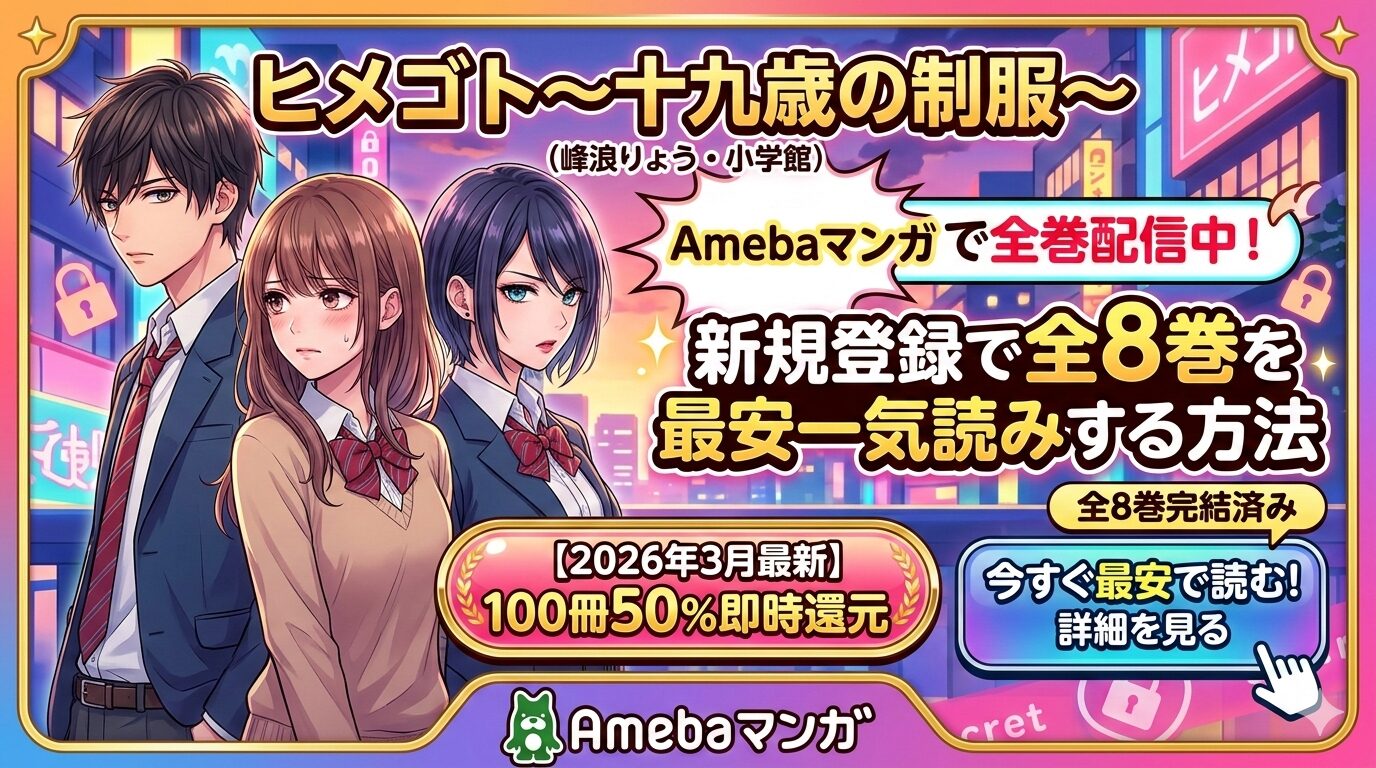 2026年3月時点で、「ヒメゴト~十九歳の制服~」(峰浪りょう著・小学館)はAmebaマンガにて全8巻が配信されています。新規登録時に付与される「100冊まで最大50%即時還元クーポン」を活用すれば、全巻まとめ買いでも大幅にお得に読むことができます。完結済み作品のため、一気読みに最適です。