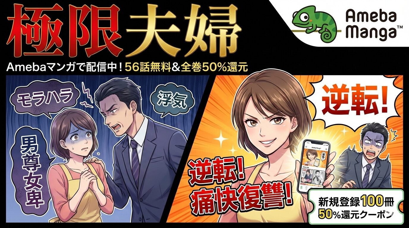 「極限夫婦」は、モラハラ・浮気・男尊女卑に苦しむ妻たちが鮮やかに逆転する痛快復讐オムニバス漫画です。Amebaマンガなら分冊版56話が無料で読めるうえ、新規登録の100冊50%即時還元クーポンを使えば残りの有料分も実質半額。全巻まとめ買いでも約2,800〜3,080円で一気読みできます。