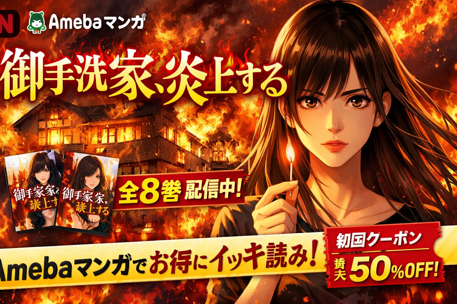 2026年2月21日時点で、「御手洗家、炎上する」はAmebaマンガにて全8巻(全117話・完結済み)が配信されています。さらに2冊分は無料で読めるため、まずは試し読みしてから購入を検討することも可能です。Amebaマンガの初回限定クーポン(100冊まで最大50%即時還元)を使えば、全巻まとめ買いでも約3,168円と、他の電子書籍サービスと比較してもトップクラスのコスパを誇ります。