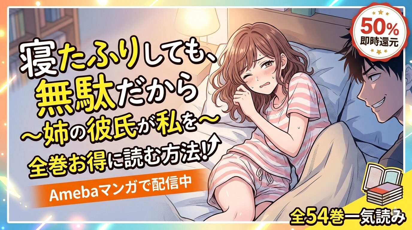 「寝たふりしても、無駄だから~姉の彼氏が私を~」を全巻お得に読みたい方へ。結論から言うと、Amebaマンガなら話売り全54巻が配信中で、新規登録の100冊50%即時還元を使えば実質約4,455円で一気読みできます。完結済みの今だからこそ、最安で最後まで駆け抜ける方法を徹底解説します。