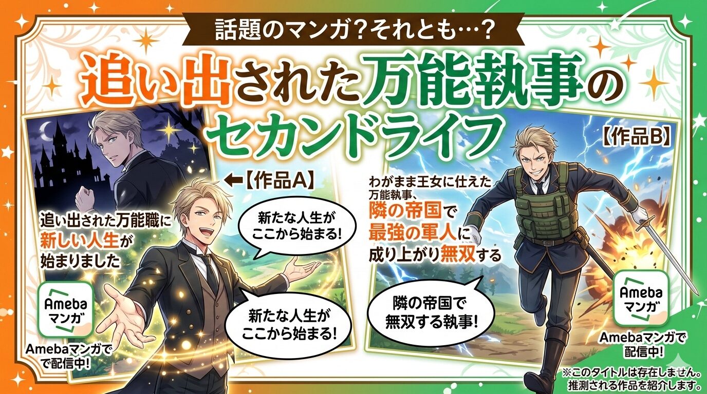 「追い出された万能執事のセカンドライフ」で検索してこの記事にたどり着いた方へ、結論からお伝えします。このタイトルに完全一致する作品は存在しませんが、キーワードの要素が重なる2作品「追い出された万能職に新しい人生が始まりました」と「わがまま王女に仕えた万能執事、隣の帝国で最強の軍人に成り上がり無双する」がどちらもAmebaマンガで配信中です。