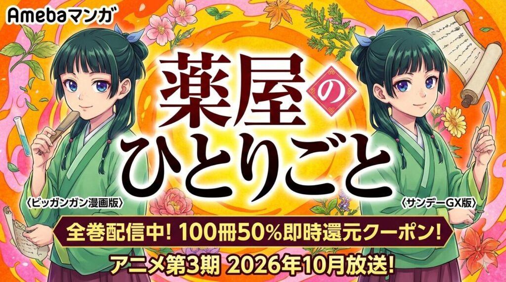 「薬屋のひとりごと」の漫画は2種類ともAmebaマンガで全巻配信中です。新規登録の100冊50%即時還元クーポンを使えば、ビッグガンガン版全16巻が実質約5,600円、サンデーGX版全21巻が実質約7,245円で一気読みできます。2026年10月にアニメ第3期も控える今、... -