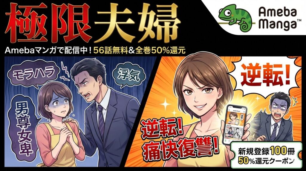 「極限夫婦」はAmebaマンガで56話無料+全巻50%還元!モラハラ夫への痛快復讐劇を最安で一気読みする方法【2026年2月最新】