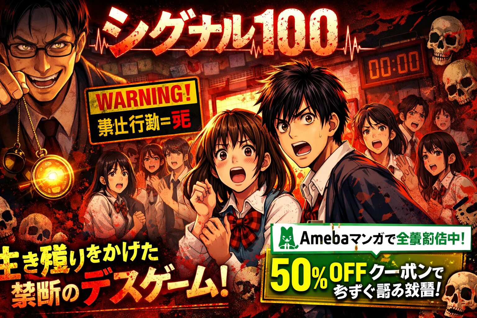「シグナル100」は、担任教師に自殺催眠をかけられた36人の高校生が”禁止行動”に怯えながら生き残りをかけて極限状態に追い込まれるデスゲーム漫画です。全4巻で完結済みのため一気読みとの相性が抜群。結論から言えば、Amebaマンガなら新規登録時の100冊50%即時還元を使って、本編全4巻+スピンオフ「零」の計5巻を実質約1,725円で読破できます。