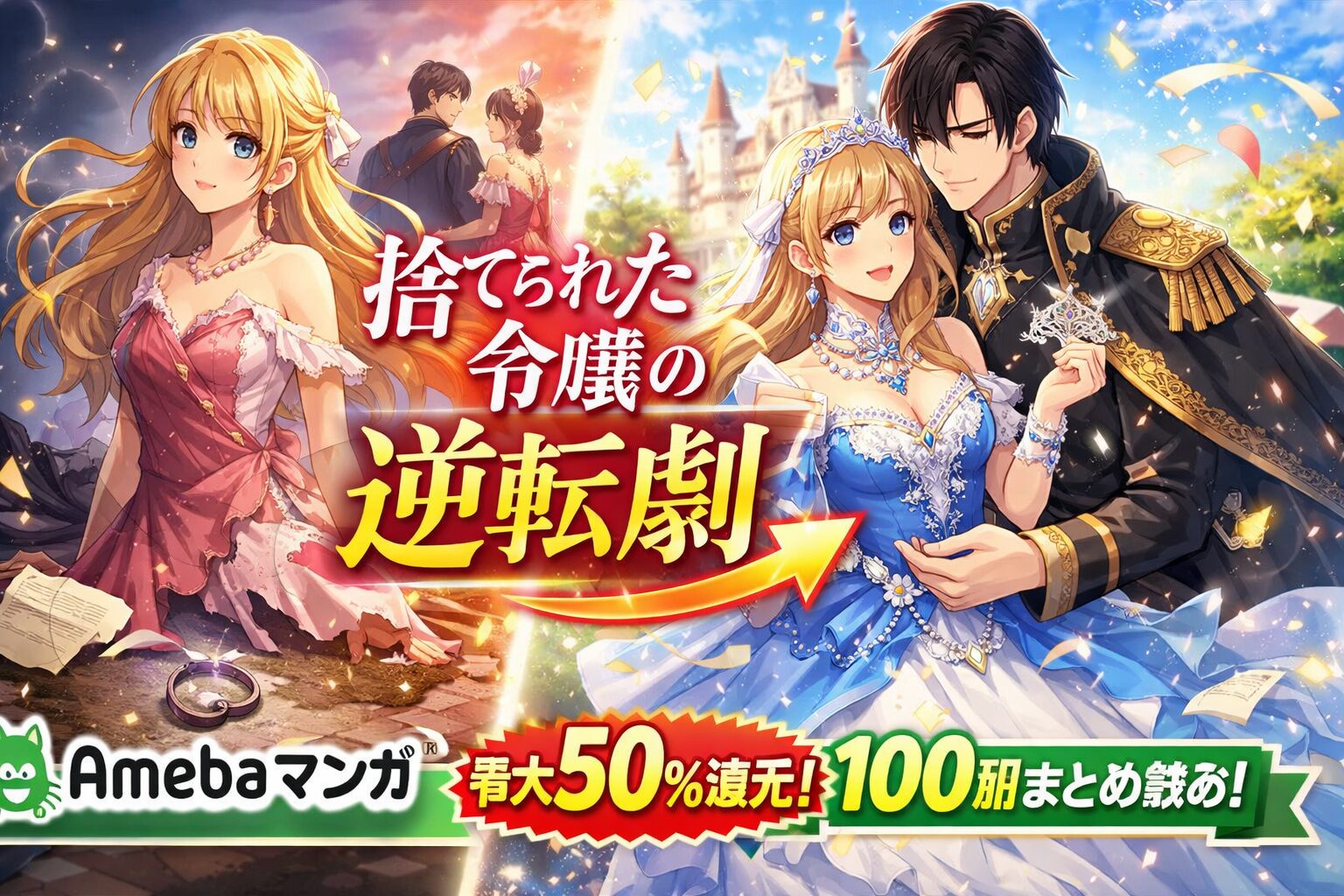 婚約破棄された令嬢が華麗に逆転する――そんな痛快なストーリーを一気に読みたい方に朗報です。「捨てられた令嬢の逆転劇」というテーマに該当する人気作品は、Amebaマンガで多数配信されており、新規登録で100冊まで最大50%即時還元を受けられます。まとめ買いのコスパを重視するなら、Amebaマンガが最もお得な選択肢です。
