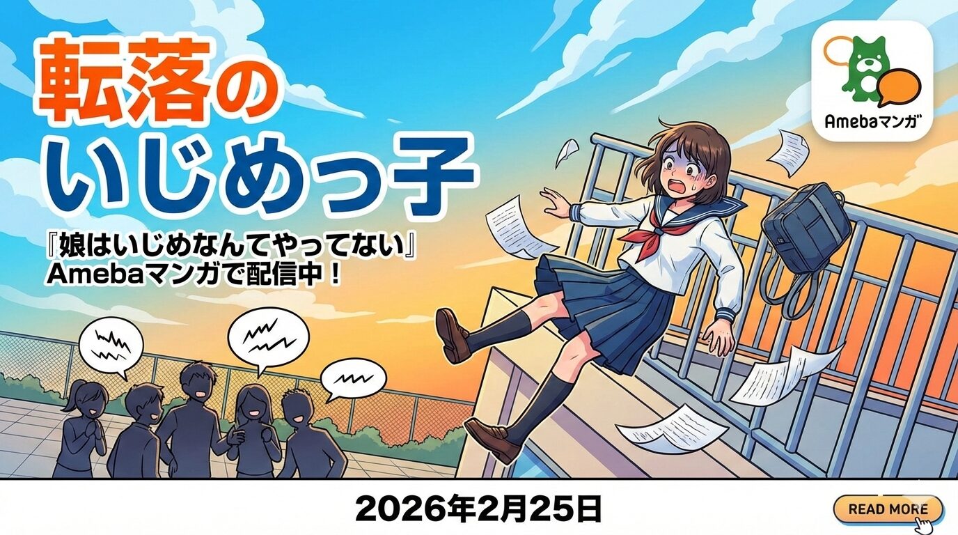 2026年2月25日時点の確認結果をお伝えします。「転落のいじめっ子」という正式タイトルのマンガは存在しませんが、検索意図に該当する作品『娘はいじめなんてやってない』はAmebaマンガにて配信されています。全1巻完結の作品で、通常価格は1,200円(税込相当)ですが、Amebaマンガの新規登録特典「100冊まで最大50%即時還元」を利用すれば実質約600円で購入可能です。加害者の親という異色の視点で描かれたいじめ問題の深層に、読んだ後もゾッとする余韻が残る一冊です。