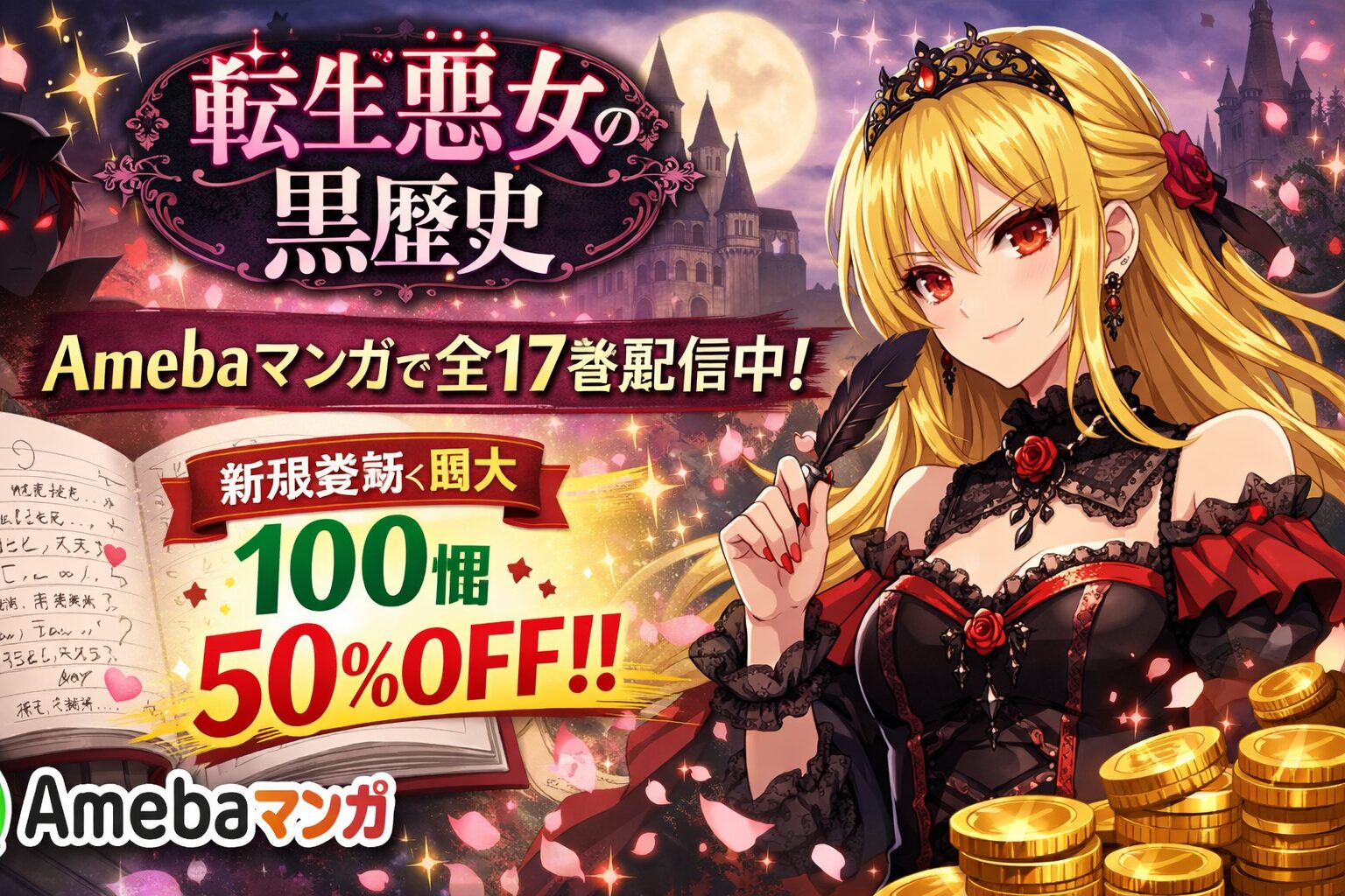 【結論】「転生悪女の黒歴史」はAmebaマンガで全17巻を配信中です(2026年3月確認)。新規登録の100冊まで最大50%即時還元を適用すれば、全巻の定価約9,000円が実質約4,500円で購入できます。18巻は2026年4月3日に発売予定です。