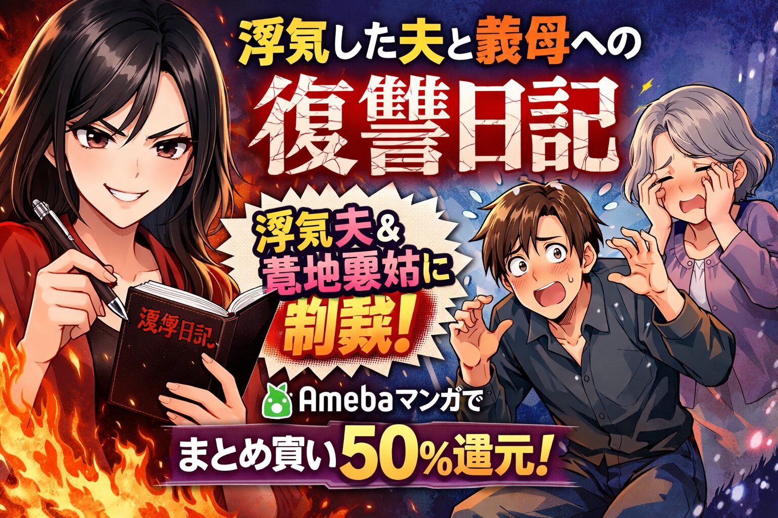 「浮気した夫と義母への復讐日記」で検索してこのページにたどり着いた方へ。結論からお伝えすると、このタイトルと完全に一致するマンガ作品は、2026年3月時点で確認できませんでした。ただし「浮気夫」と「義母」に復讐するテーマのマンガは数多く存在し、Amebaマンガならまとめ買い最大50%還元で一気読みが可能です。